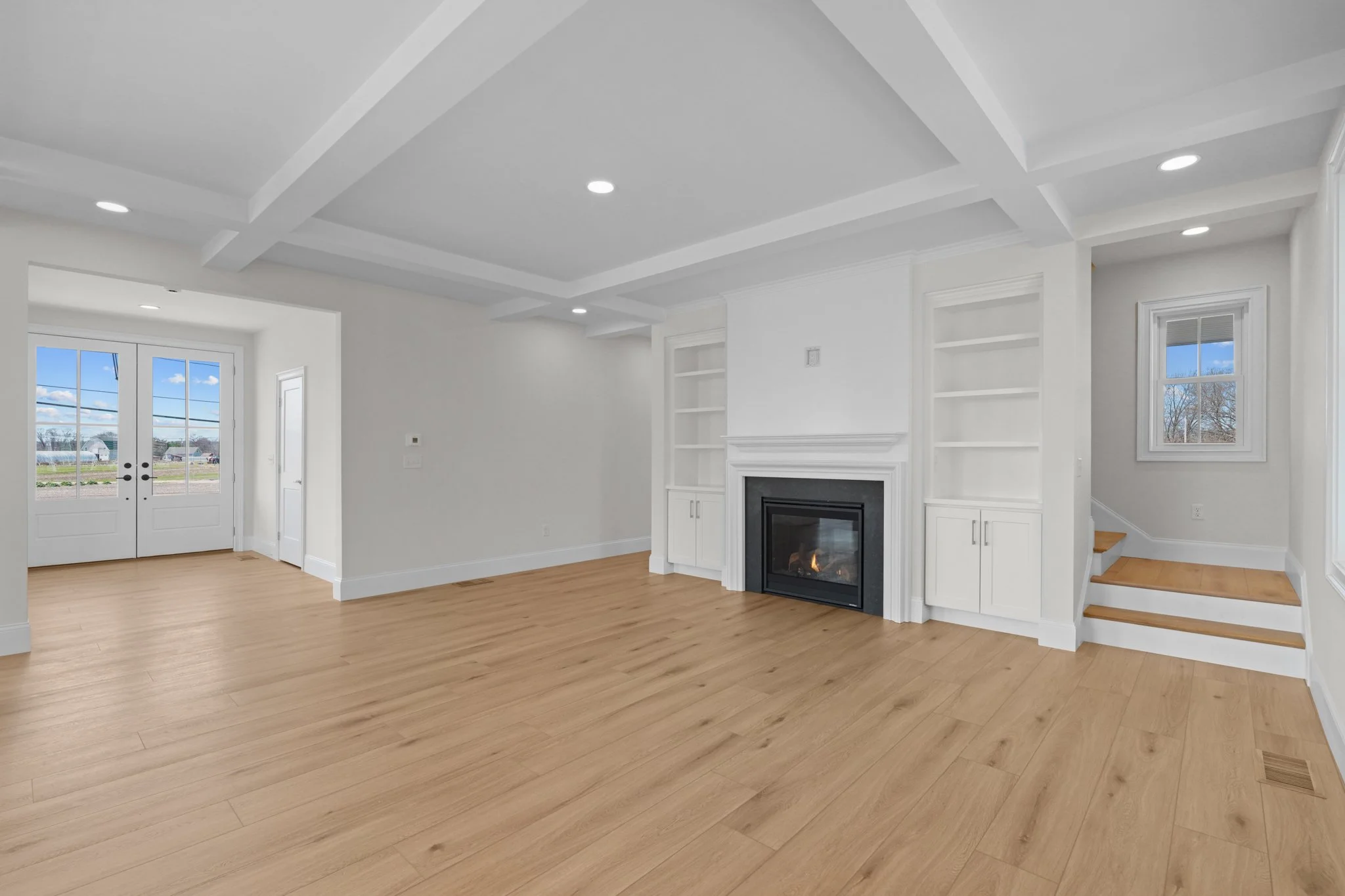 Custom kitchen and living spaces enhanced by coffered ceiling detailing