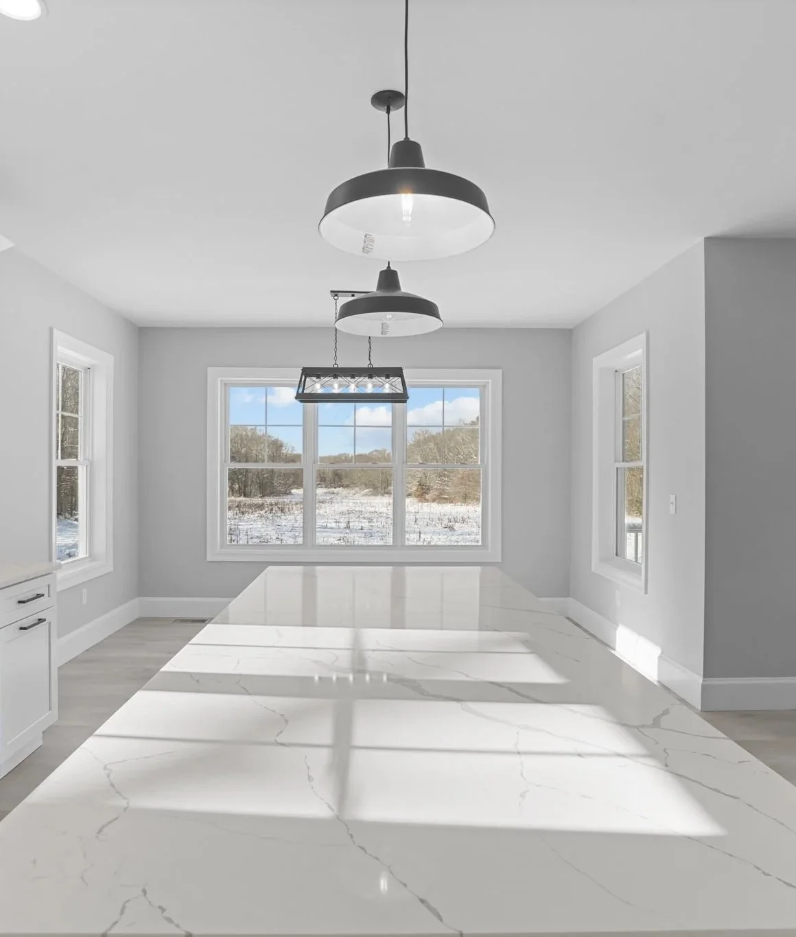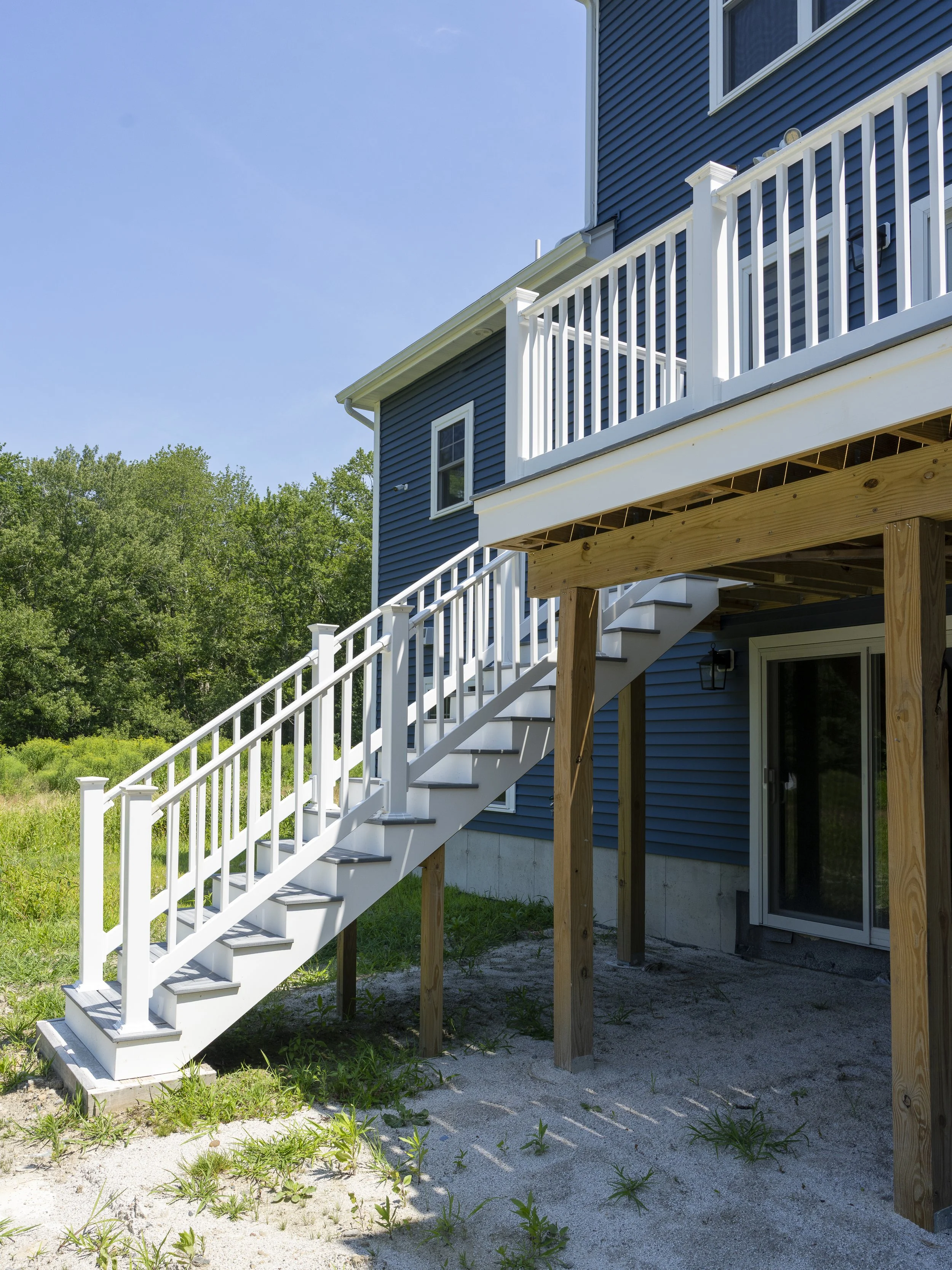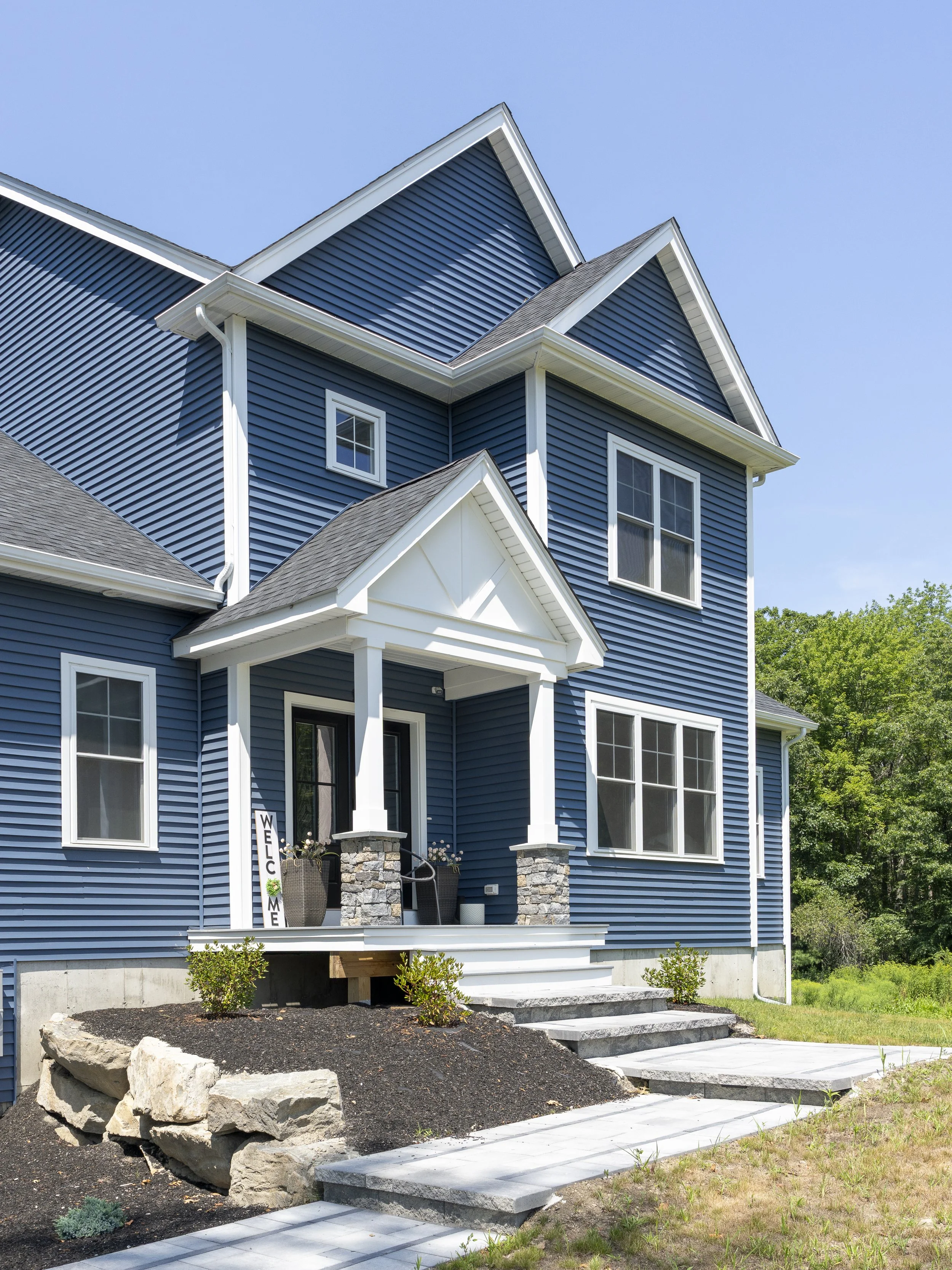 A custom new construction home in Rehoboth, Massachusetts, thoughtfully designed to align with the client’s budget while maintaining a clean, cohesive aesthetic. The home was strategically planned to work with the natural topography of the land—integrating a garage beneath the main living space and maximizing flow throughout. With an open-concept layout, simple architectural detailing, and a restrained monochromatic palette, the design prioritizes clarity, function, and ease of execution without compromising on quality.