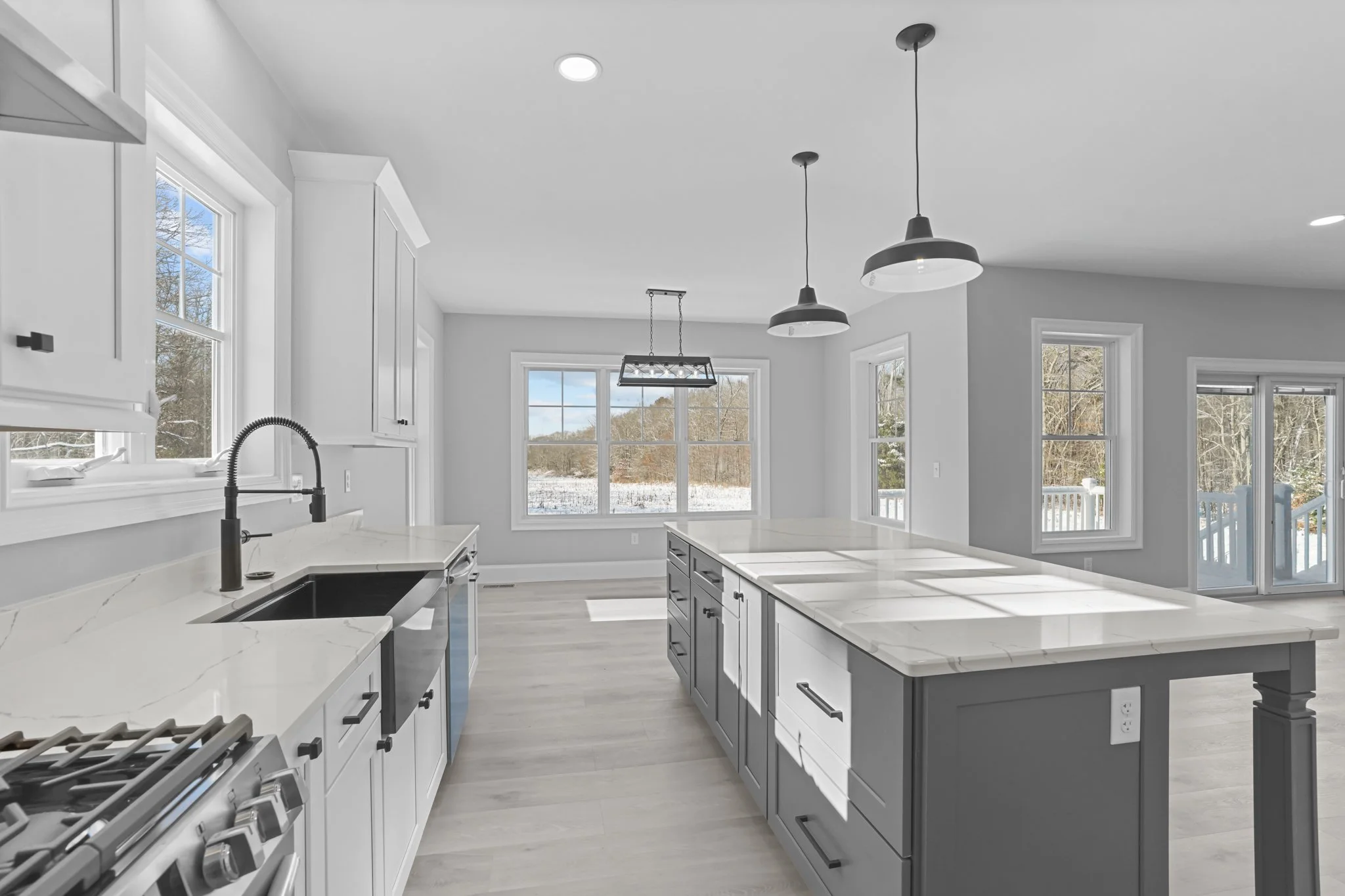 Open-concept floor plan creating a seamless flow between kitchen, dining, and living spaces